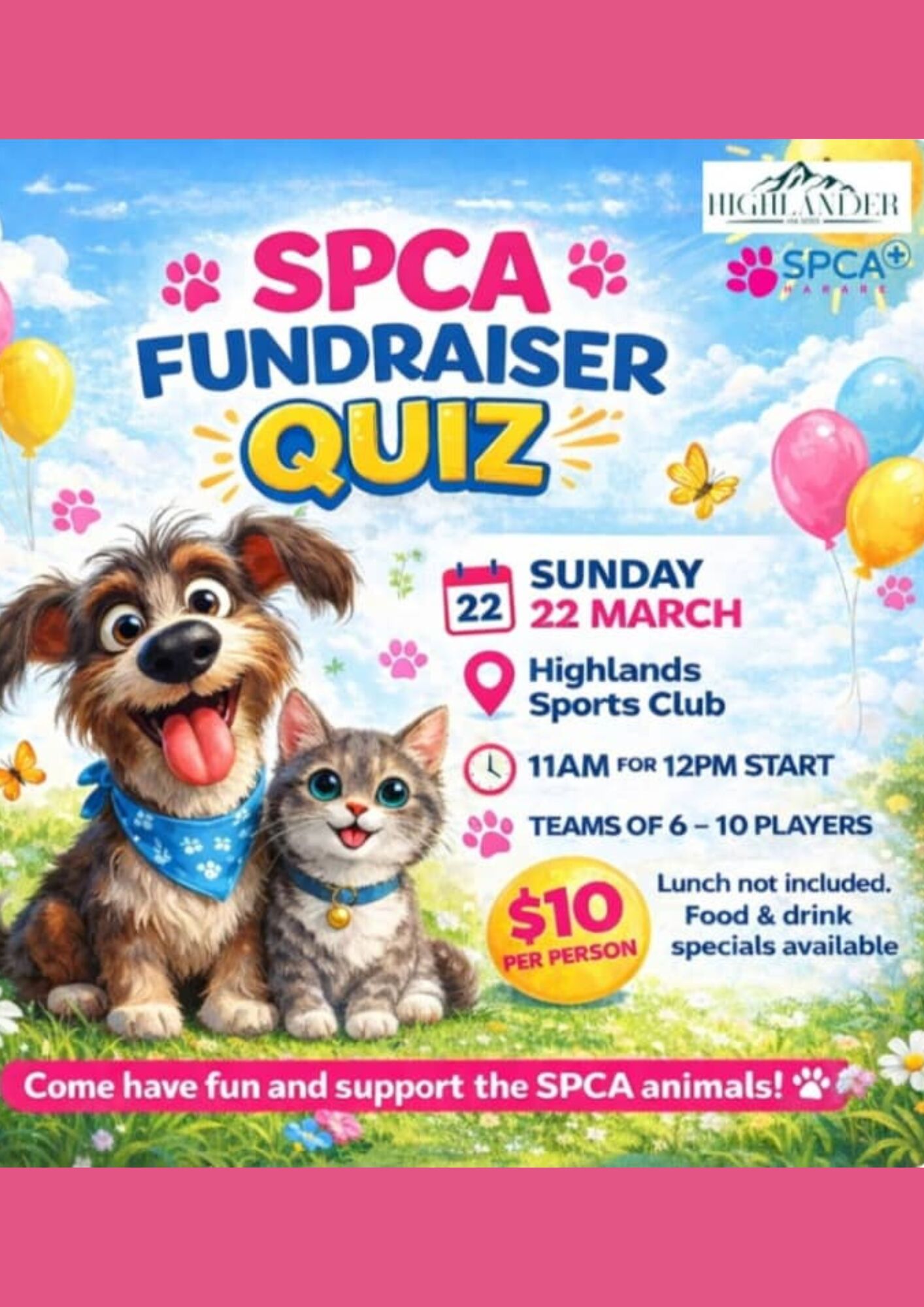 SPCA Fundraiser Quiz Sunday, 22nd March | Highlands sports club | 11 am for 12 pm start | Teams of 6 to 10 players | $10 per person | Food and drink specials available.