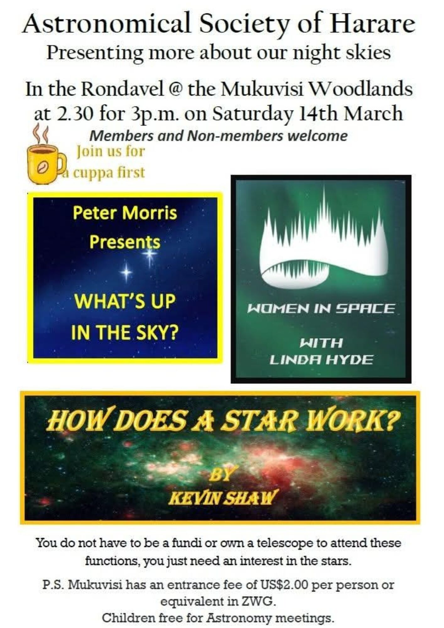 Astronomical Society of Harare Saturday, 14th March | 2:30 pm | US$2 | The Rondavel Mukuvisi | Woodlands | Free for children under 12 attending the astronomy meeting.