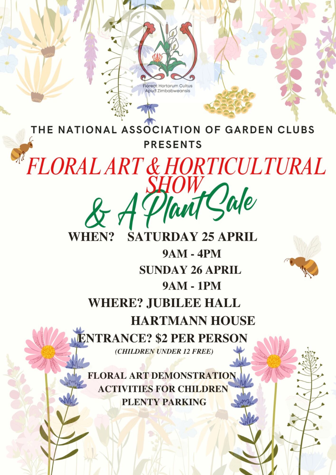 Floral Art & Horticultural Show Save the date for 25/26 April | At Jubilee Hall Hartmann House | $2 per person | Children under 12 free | By the National Association of Garden Clubs
