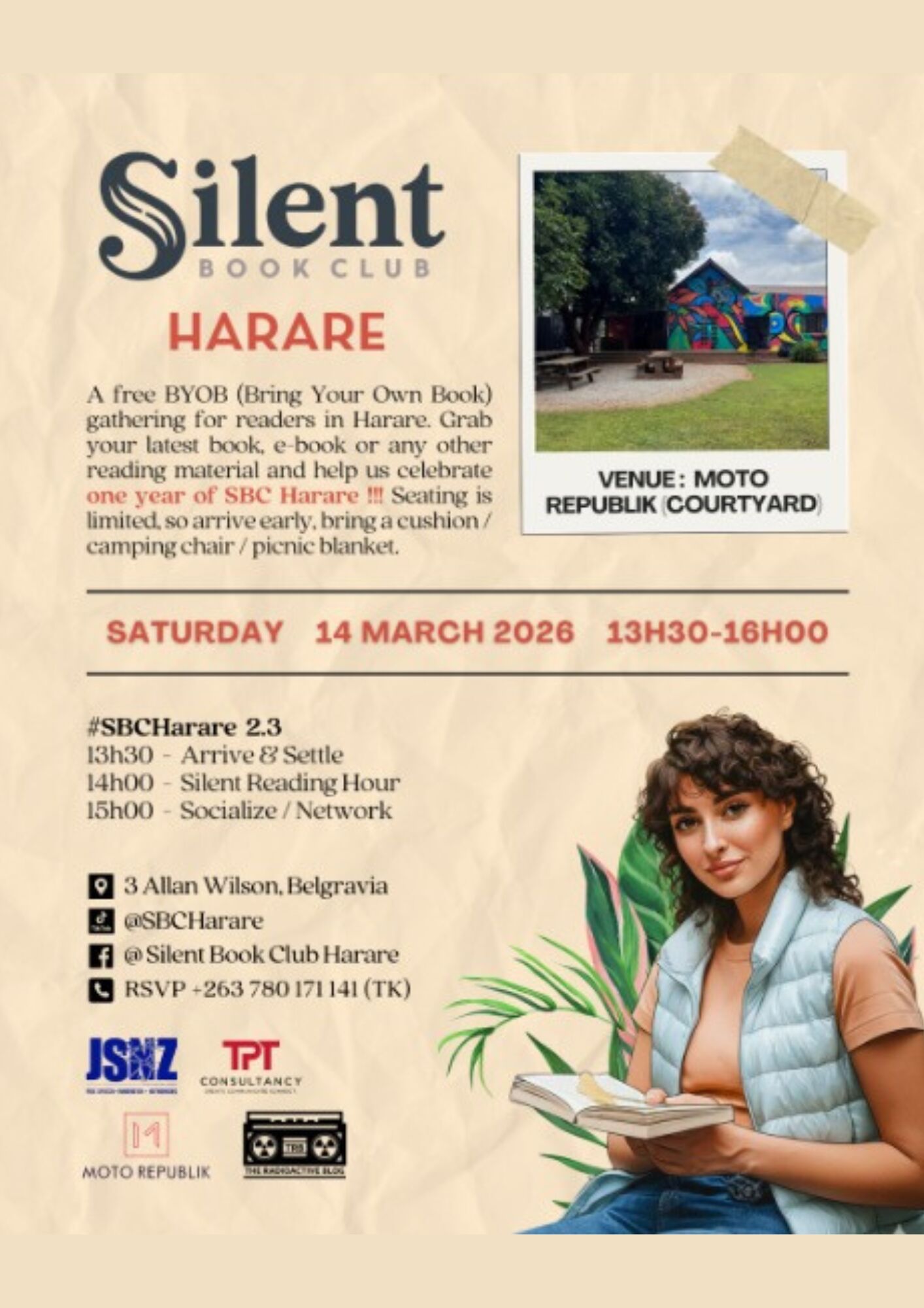 Silent Book Club Join at Moto Republik as they celebrate one year of SBC Harare | 3:30 – Arrive & settle | 14:00 – Silent Reading Hour | 15:00 – Socialize & network